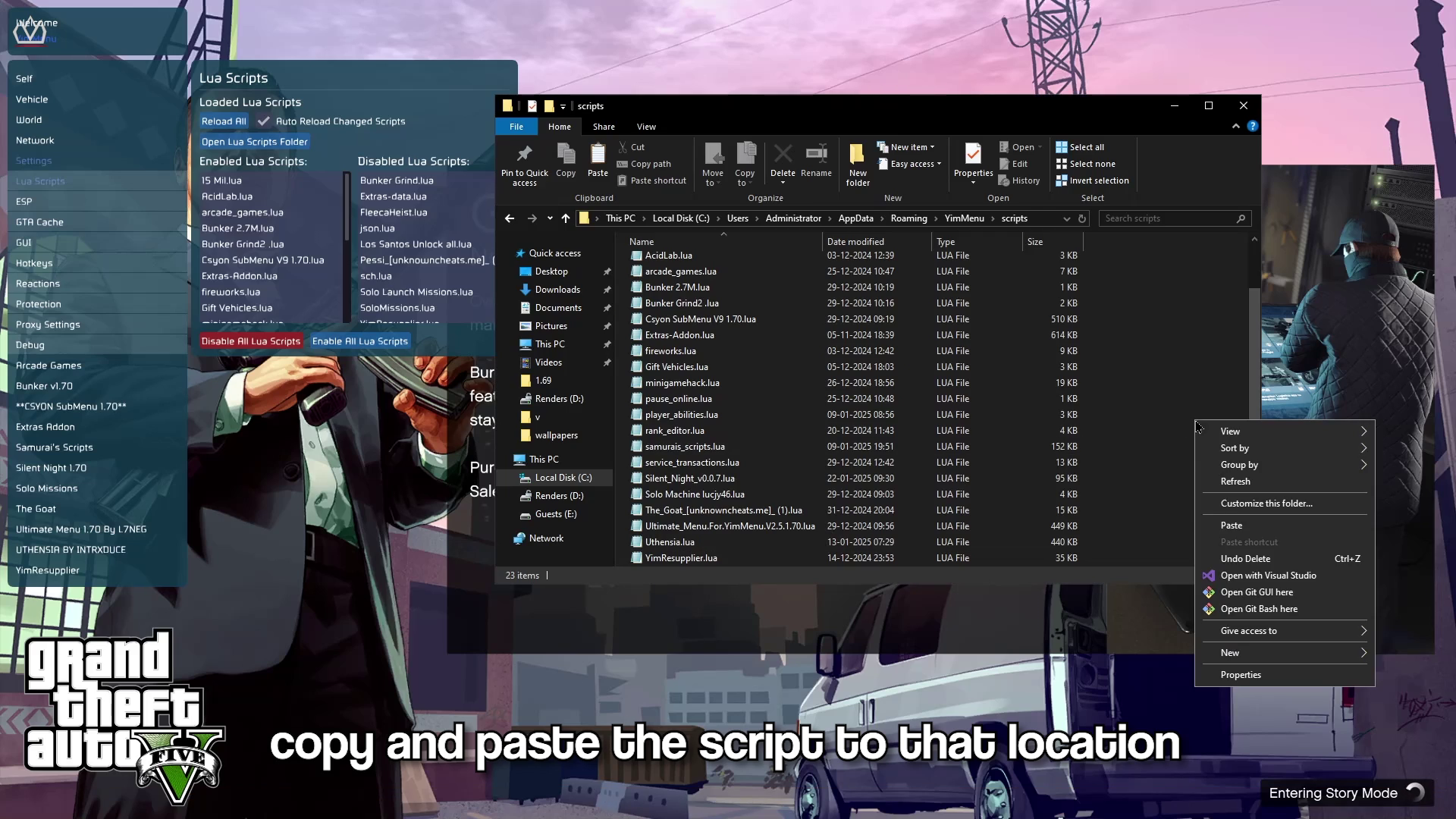 Step 2 : Later on Join the FreeMode Session / Lobby / Solo Session as your comfortable with any of it then try to Open Yim Menu by Pressing "INSERT" Key, Then open the Settings > Lua Scripts > Open Lua Scripts Folder, once the Folder has been opened then copy and paste the script which you have downloaded into that scripts folder, as on the picture below
